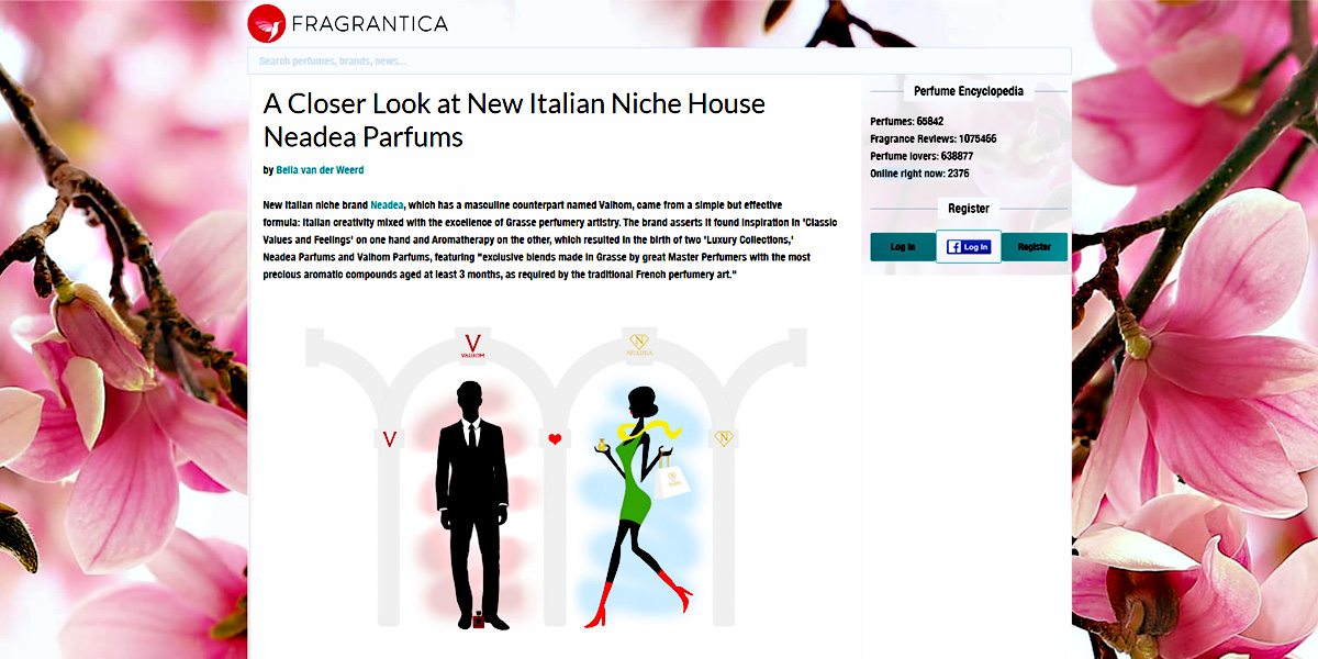 Il brand di nicchia italiano Neadea, che ha un omologo maschile dal nome Valhom, è nato da una formula semplice ma efficace: creatività italiana abbinata all'eccellenza dell'arte profumiera di Grasse. La casa dichiara di ispirarsi a valori e sentimenti classici da un lato e all'aromaterapia dall'altro, risultandone due 'Luxury Collections', Neadea Parfums e Valhom Parfums, caratterizzate da miscele esclusive create "dai Maestri profumieri di Grasse secondo gli antichi rituali della tradizione francese, selezionando solo gli estratti più pregiati e affinati da una macerazione di almeno tre mesi".Le Luxury Collections Neadea (dal greco nea + thea, 'nuova dea') e Valhom (dal tardo latino valor + homo, 'uomo di valore') mirano a catturare atmosfere, valori e sentimenti del Classicismo traducendoli in miscele esclusive che rendono straordinaria l'esperienza olfattiva. Ciascuna fragranza, realizzata con un'alta concentrazione di olio profumato (30%), è stata creata usando materie prime pregiate, e il brand ha scelto di affidare la creazione dei suoi profumi ad un team di nasi diversi, ciascuno con una propria expertise e sensibilità.